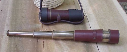 This is a fantastic 4 draw leather covered brass telescope with sun shield. Optics are crystal clear, Mag. 2 X plus approaching 3 X. That is my best guess. And check out the protective leather covers with strap. Perfect for hanging your telescope away when not in use. Fully extended it measures 16 inches long not counting the sun screen. When closed it is only 7 inches long! it stores anywhere! Perfect for anyone who loves good quality optics.