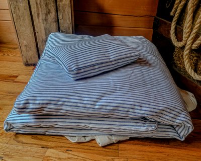 Our 1st rate mattress and pillows are made from 100% blue and white cotton ticking just as the originals were. Our standard length is 6 foot by a width of 2 foot with a 1 1/2 inch gussett all around. Then we over stuff it to measure about 3 inches thick. The pillow measures 12 by 10 inches and again about 3 inches thick. Rolls up easily and ties with string to make a small bundle for transport. I don't know how you could make a good nights sleep any easier than this.