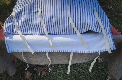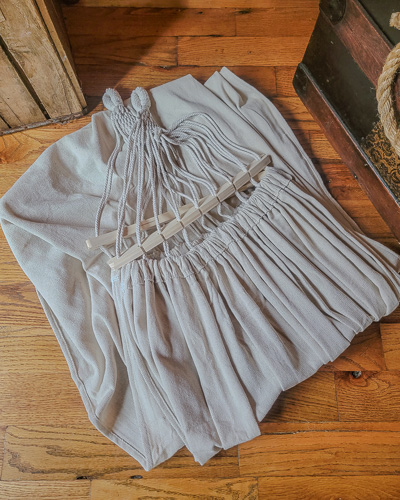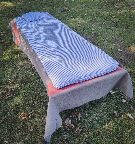 For some of you with limited space, (car pooling to an event) a mattress ticking that you can empty out and roll up into a small bundle is just the thing. Our mattress ticking measures 6 ft. long and is 2 ft. wide. It fits a standard cot perfectly. When you arrive at the event just take your ticking and stuff it full of straw or hay. Then tie the end shut. You are good to go for the whole weekend! A nice soft mattress for your cot or the ground. If using it on the ground be sure to put a gum blanket under it with the black side down. You'll sleep like a champ. Then when the event is over just empty your ticking, fold it up and away you go.