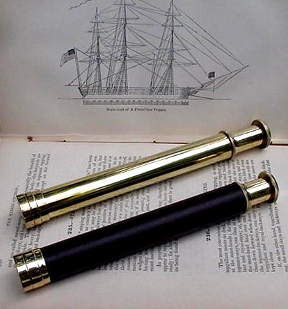 I have to admit - I do love telescopes and optics in general. So you'll understand that I could not pass these up. These little telescopes measure 6 inches long when closed, 9 inches when fully extended. The fore tube is 3/4 of an inch. I suspect their magnification is about 2X. Both have brass "forward" lens cap covers to help prevent scratching when stowed away. This is one piece of equipment that you will use at every event!