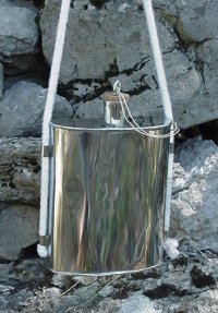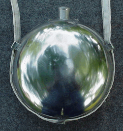 Our stainless steel Kidney Shaped Canteen is of a similar style to that used in the Revolutionary War but shows many of the attributes used in some known Confederate models. It has a cotton cord sling, a wooden plug for a cork. It also has a hemp string attached to help you keep up with your cork. Very sturdy and well made. You'll have a tuff time crushing this one. But don't worry, I'm sure you'll figure out a way to do it.