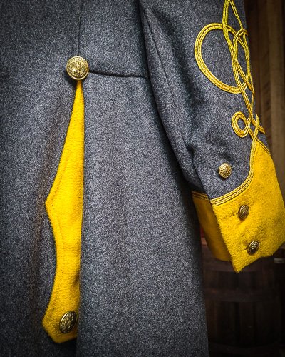 All Blockade Runner brand single breasted frock coats are made from 100% wool, never a blend. They have a 9 button front with 2 buttons on each cuff and 2 on the each side in the rear for Confederates. One inner pocket over left breast and one hidden in the tail. Lined with black polished cotton as per many of the originals. It comes standard lined to the waist.