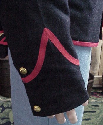 Our 1858 pattern artillery jacket is made of 100% federal blue wool with a black cotton lining in the body and white cotton muslin in the sleeves. It has 3/8 inch red cotton tape around the top and bottom of the collar, down the front and around the bottom of the coat and the inverted v on the working cuffs which have 2 hand worked button holes and 2 small union eagle buttons sewn on. The 2 belt pillows on the back of the jacket are trimmed with red tape as well.