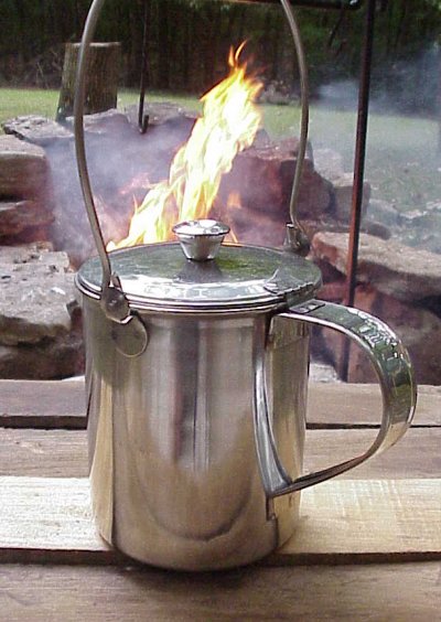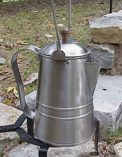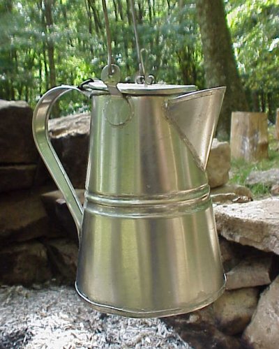 Here's a great little "personal size" Ribbed Tin Coffee Pot that's just the right to hang off your back pack or haversack. I'm not going anywhere without my coffee pot and the more convenient the better. This little devil holds about a quart give or take a sip. The lid is hinged so you don't have to worry about dropping it into the campfire. The handle and the bail are large enough you can get your hand around them for a good grip. It stands about 6 1/2 inches tall and just for the record those of you who drink Coke for breakfast are communist.