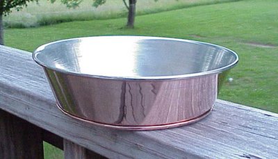 We now have 3 sizes of copper bowls available. The smallest bowl is similar in size and shape to our old "New Jersey" bowl. It measures 8 inches wide at the top and stands 2 1/2 inches tall. It will hold an entire quart of soup or stew. It will easily take the place of all your other plates and bowls. It holds more than most can eat in one sitting.