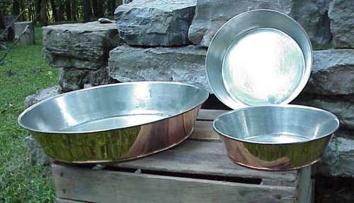 Large size tin lined copper bowl. Measures 14 1/2 inches wide and 3 inches tall. Just right for a wash bowl.