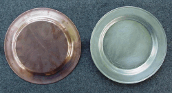 Our plate is made here in the states one at a time. Hand spun on wooden molds just as the originals were. They are then tinned over a charcoal fire one at a time using the exact same process used in the 1860's. They measure 8 1/2 inches wide and approx. 1 inch deep.