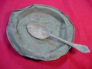 Since we introduced our copper mess plate we have watched several of our friends here in Middle Tennessee dig even more of these originals. The photo above is of one of the nicest ones to come out of the ground lately. It was dug in one of CS General Van Dorn's camps near Columbia Tennessee. Larry Hicklen had it for sale at his shop (Yesteryear, you can find it on our links page) and it sold before I knew he had it! I should have checked more often. Anyway I just thought you would like to see it. Cool pewter spoon too! Just in case you are curious, this plate sold for $75.00 That was a steal. Just a few weeks ago I offered a guy $150. for one that was just a little better than this one and he turned me down. I did buy one last week that was dug in Lynchburg Tn. for $45. but it is in pretty rough shape.