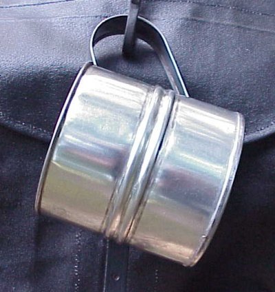 When I have to travel light I always make sure I have one of these Canteen Halves. They weigh practically nothing. The wire loop fits over your canteen's spout so the 1/2 fits snug against it. That's one less item to go into your haversack!