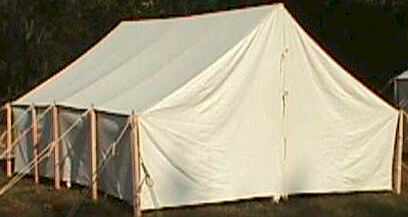 This is the typical A frame/wedge tent that you see at all of the reenactments. (10 billion served so to speak) Two people and their gear will fit in this tent with no problem. But don't invite any company over! The reason this tent is so popular among reenactors is it gives you the most room with the least amount of weight. It's easy to pack in and it can be set up by one person. You just have to walk from end to end a couple of times.