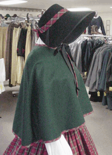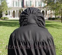 Haley, on the left, is wearing that simplest yet always elegant garment, the Hooded Cape. It is made of black coat weight wool. It has a single button closer at the neck. It comes with an oversized hood for that "Old Country" look straight from a Grimms Brothers fairy tale. It has arm holes in each side of the cape so when needed you can easily reach out with either hand do what has to be done while leaving the other arm nestled under your cape just as warm as can be. It is unlined as in most of the south the winter climate in never severe enough to make a lining necessary. But we are always happy to accommodate our Northern friends should a lining be desired.
