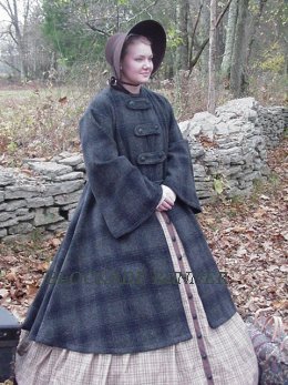 Kristina, on the right in the photo above, is wearing a wool Peletot Coat of a dark grey and blue design , a very popular coat of the era. Pick up any of the winter months issues of Godey's, Peterson's or Graham's Lady's Magazine and you will find one or two designs of, if not this exact a very similar coat every time.