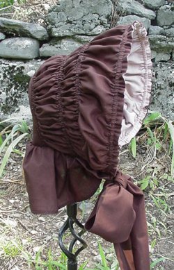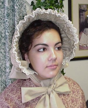 Now the cream colored bonnet is what we refer to as our basic bonnet. The ribbons are 36 inches long so if you wish you may tie a beautiful bow, if not simply let them drape either front or back. This bonnet does not extend past the brow so as not to hide your face. It does offer adequate cover from the sun or from blustery winds. The sun skirt on the back of the bonnet is of moderate length so as to accomplish the same goal.
