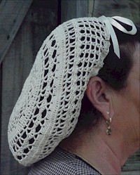 Our beautiful hand crochet snoods are made for us right here in Tennessee by a young lady who is very talented with her needles. Each snood takes a minimum of 3 hours to make. There numbers are limited but there timeless style and elegance knows no bounds. Each time you look at the meticulous stitching it harkens you back to an image of friends sitting round the hearth tending to there crochet, knitting and sewing while trading all the latest news. "Who was seen holding hands with whom?" They are held fast in place by means of a cotton ribbon tied in a bow. This lets you adjust the size of your snood to fit any hair style or length. They are available in various colors: Black, White, Cream or Ecru if you prefer. Other colors are available occasionally and we will be happy to try to help you with specific color request as long as you are not in a hurry. You will have to supply a sample of the color desired.