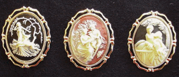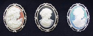 Who doesn't love Cameos? You can't even mention the word without visualizing some romantic figure from the past with a beautiful cameo pined to her collar or blouse. Our cameos are available with either a silver or gold finish backing. Of course the figure is white and we have 5 background colors. Black, Light Blue, Green, Pink or Shell which has a orange hue. They fasten by means of a pin with safety latch. Yes I know safety latches are not period correct but the likelihood of you losing your cameo should you not have one is just too great. Some compromises are necessary. They measure two inches tall by 1.5 inches wide.